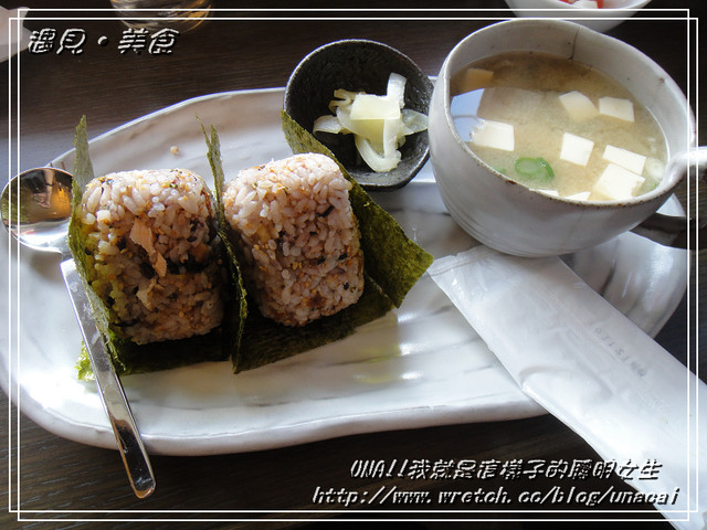 鮭魚飯糰有附贈味增湯和薑片